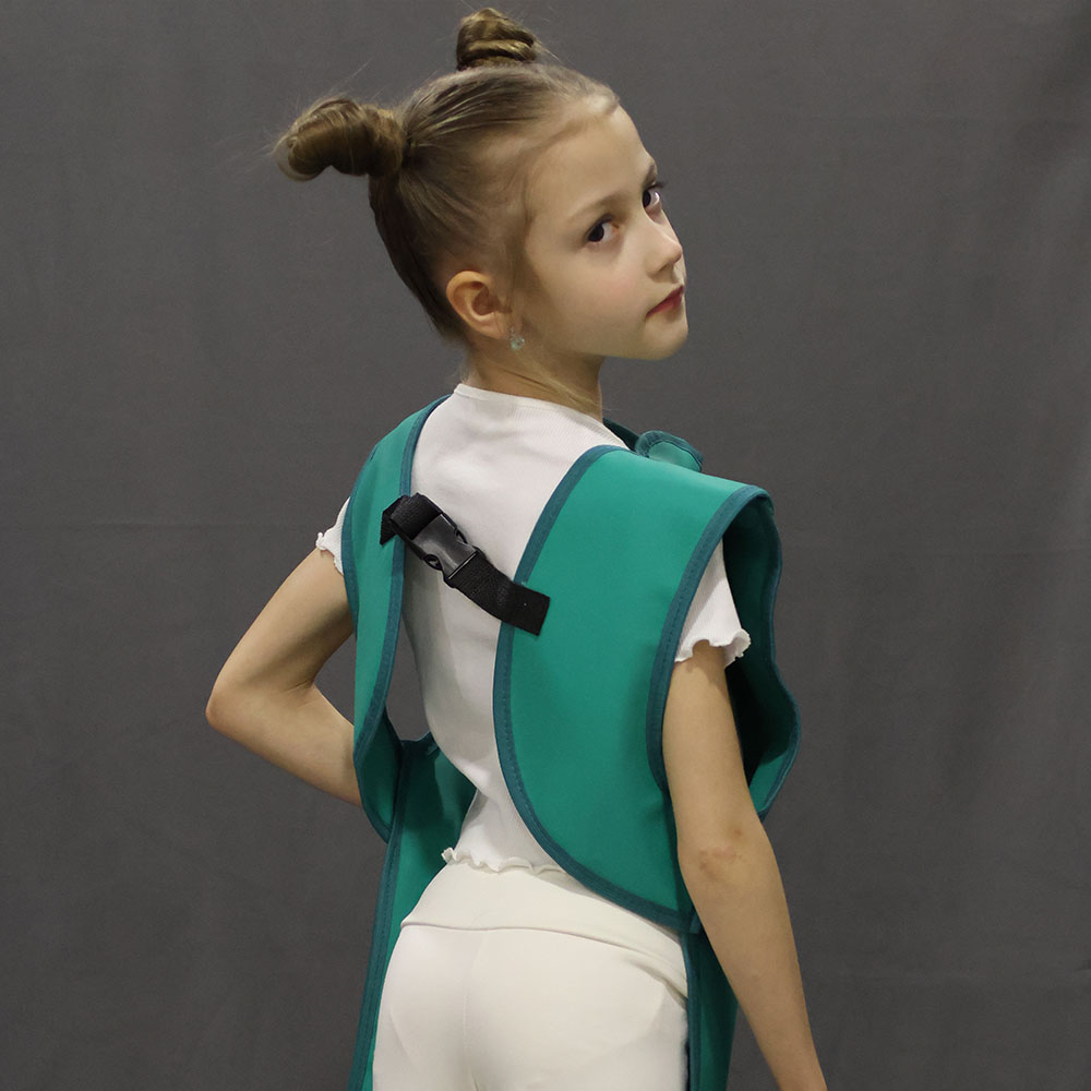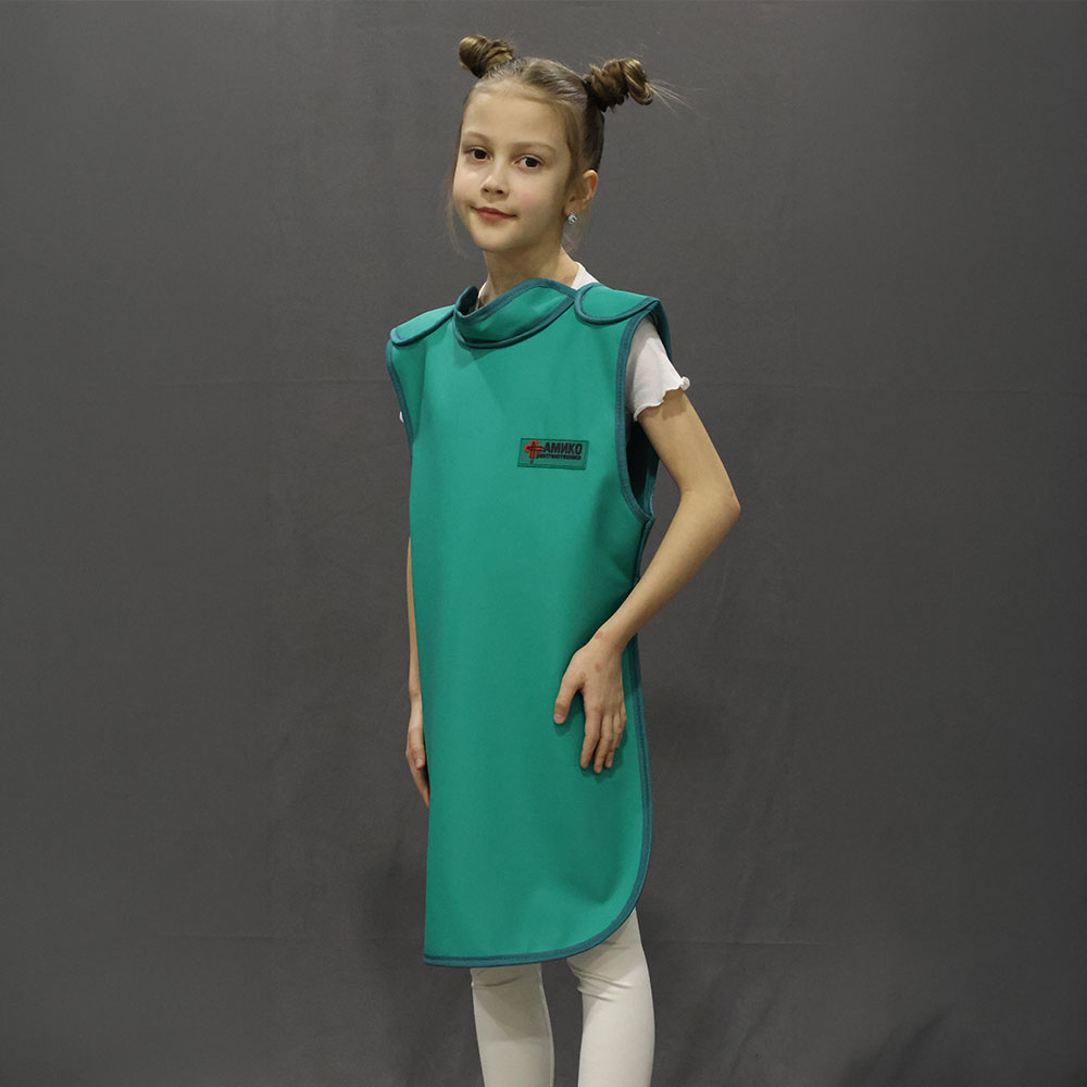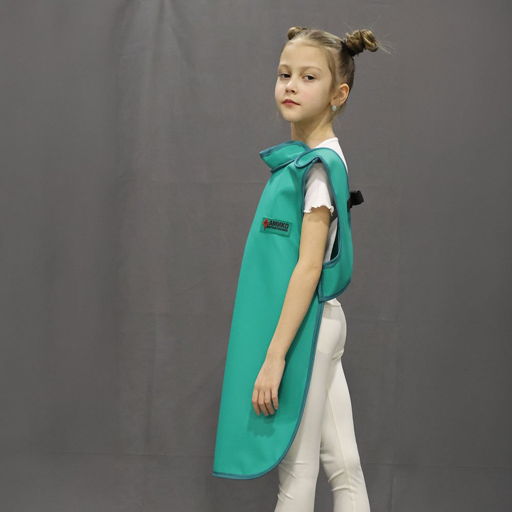 Фартук односторонний защищает тело ребенка спереди, включая плечевой пояс, от области горла до голеней. Рекомендуется применять при снимках зубов, головы и конечностей в комплексе с воротником для дополнительной защиты щитовидной железы.